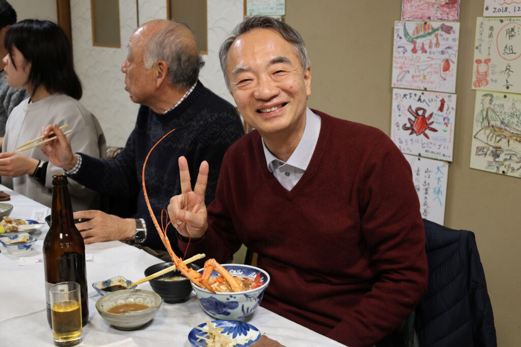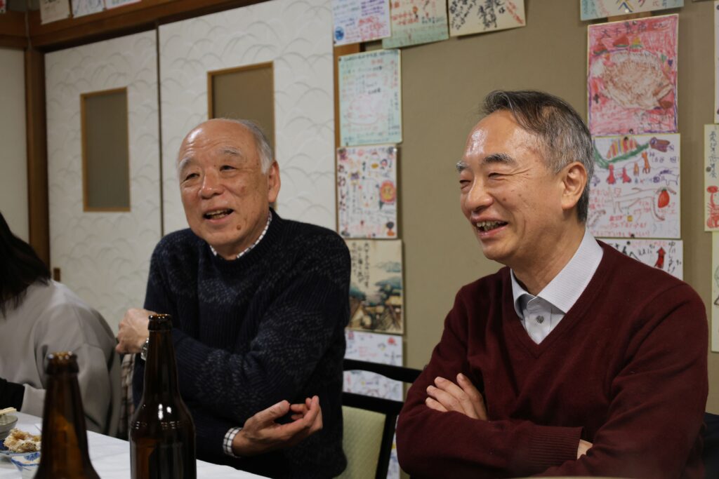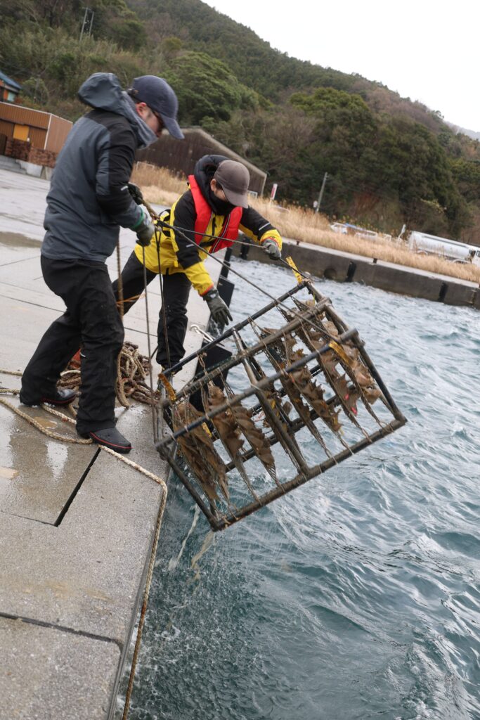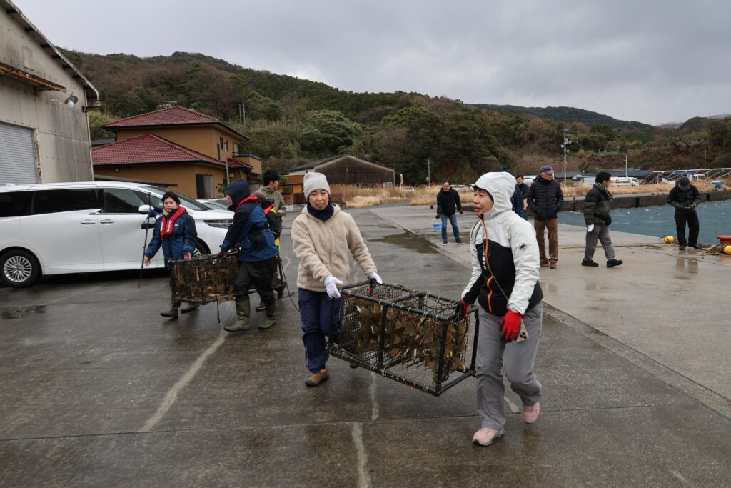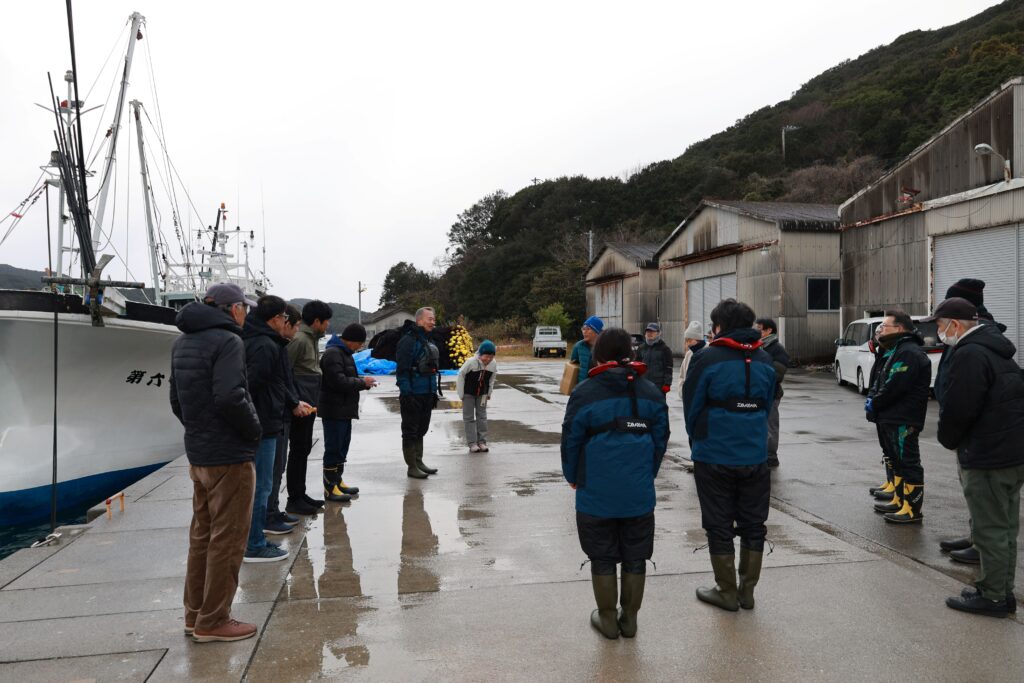 愛媛県愛南町中浦尻貝にて海洋生分解試験用サンプルの2025年度(春季)6ヶ月後の回収、(秋季)サンプル3ヶ月後回収を実施しました。愛媛大学、CERI、東京大学、山形大学、神戸大学、三菱ケミカル、ブリジストン、三井化学のメンバーが参加しました。あいにくの降雪、強風で波も高く、年に1、2回の悪天候でしたが、無事に作業を終えることができました。集合写真撮影時のみ晴れ間がのぞき今年1年の労いを感じました。プラスチック分解試験専用の新生簀を導入し、愛南町でのさらなる研究推進を目指します。懇親会では大下民宿様でのクエ鍋で身体を温め、プロジェクト発展の士気を高めました。