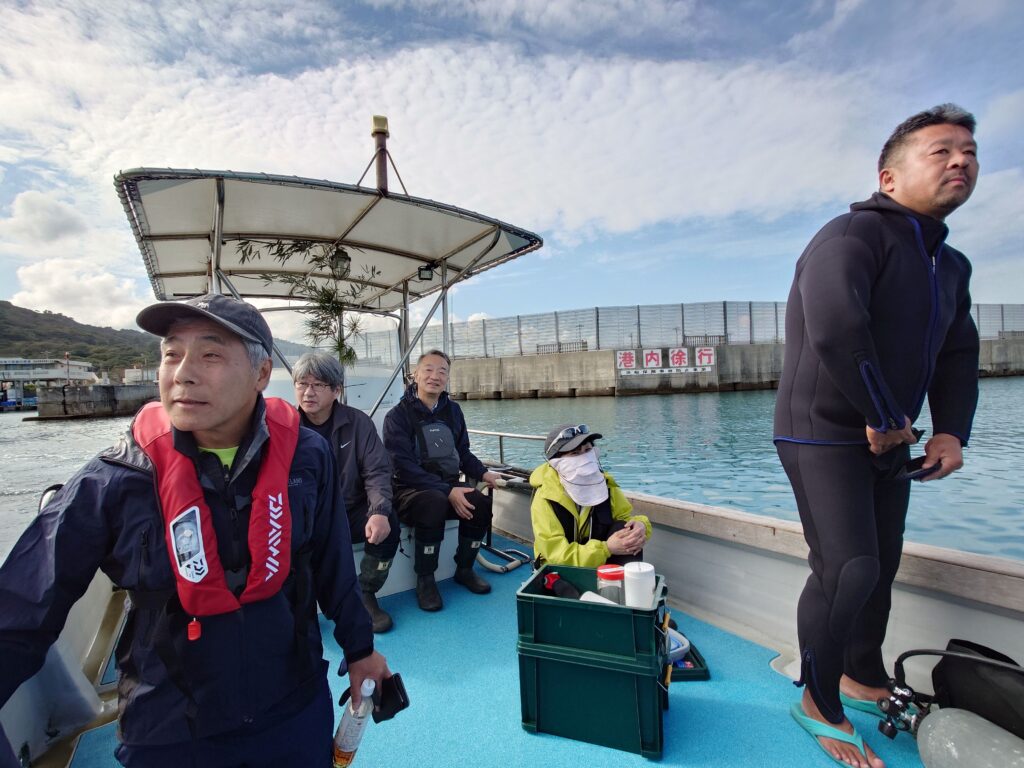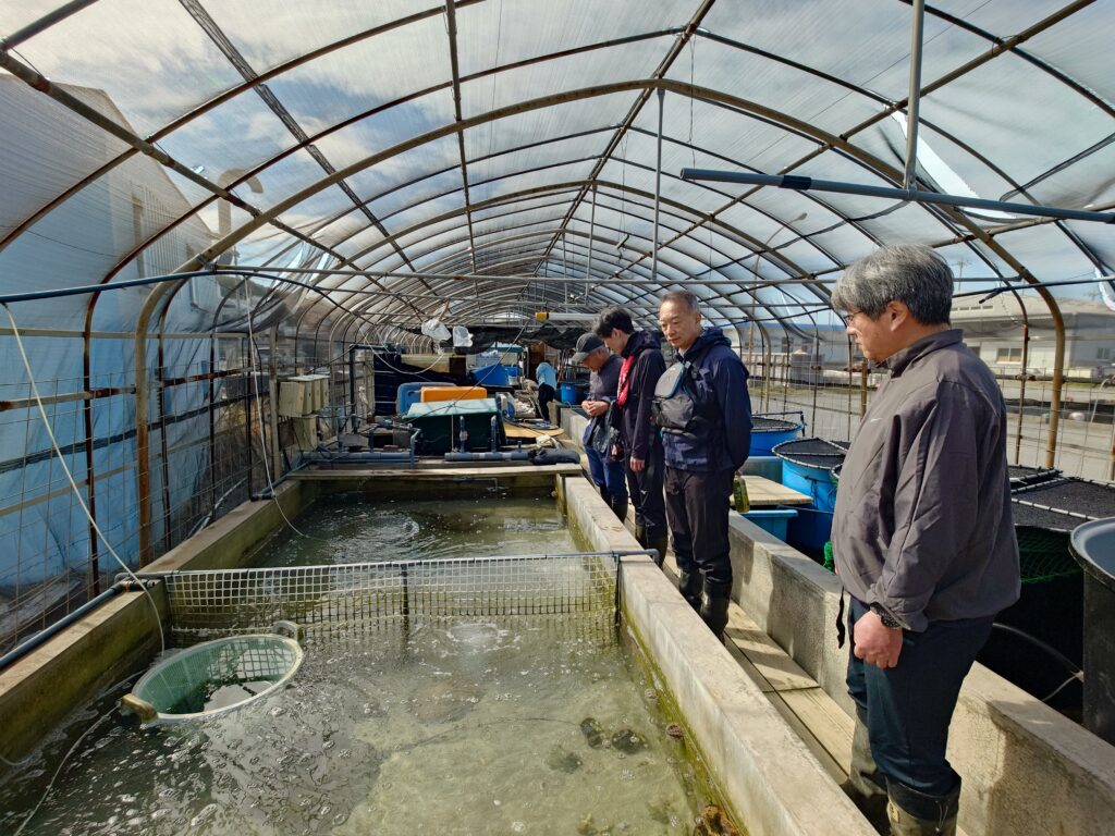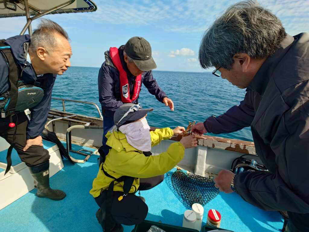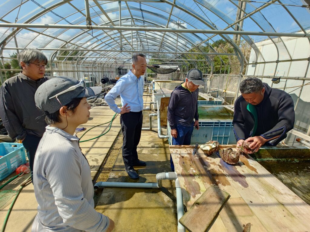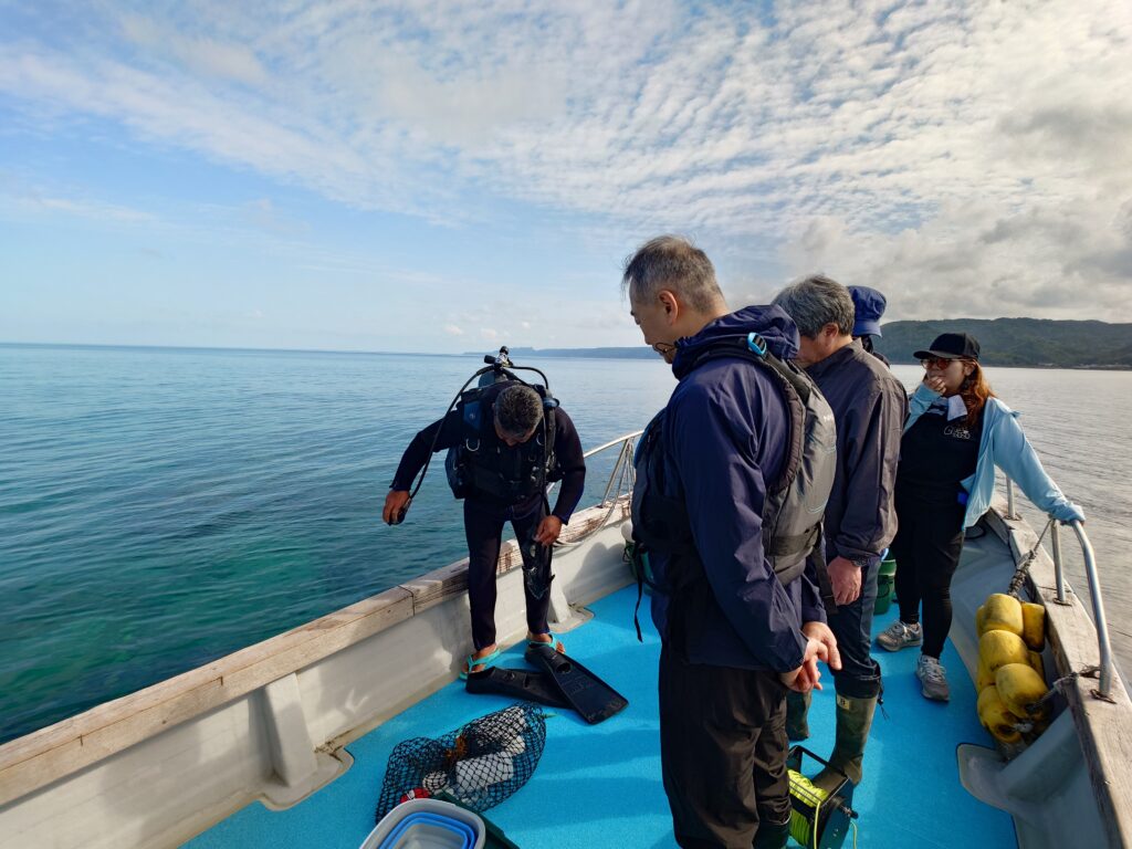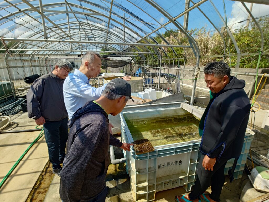 愛媛や岩手のフィールドと異なり、沖縄は養殖生簀などへのサンプル係留ではなく、海底に直接固定するため、漁師の方に海底まで潜って頂く必要があります。今回伊藤PMには水中ドローンで撮影した映像をリアルタイムで視察頂き他フィールドとの暴露環境や係留方式の違いについて把握頂きました。また、東村の海岸では特に赤土の影響が大きく、磯焼けやサンゴの白化が著しく、現地の猟師の皆さんが漁場再生のため様々なプロジェクトに参画し、種苗用の海藻栽培場の見学もさせていただきました。